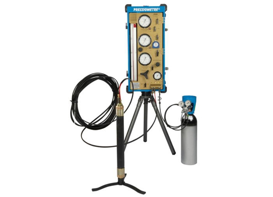 壓力供給源是一個高壓氮氣瓶。控制箱安置在一個三腳架之上。它包括一個 800 cm3 的帶有顯示管的容積計,一個主壓力調(diào)節(jié)器,一個微壓力調(diào)節(jié)器,量程分別為 0-2.5 和 0-6 MPa 的保護腔室壓力量表(進行軟土和軟巖測試時有 0.06 和 10 MPa 量程的壓力量表可供選擇),包括必需的閥門和連接管線。